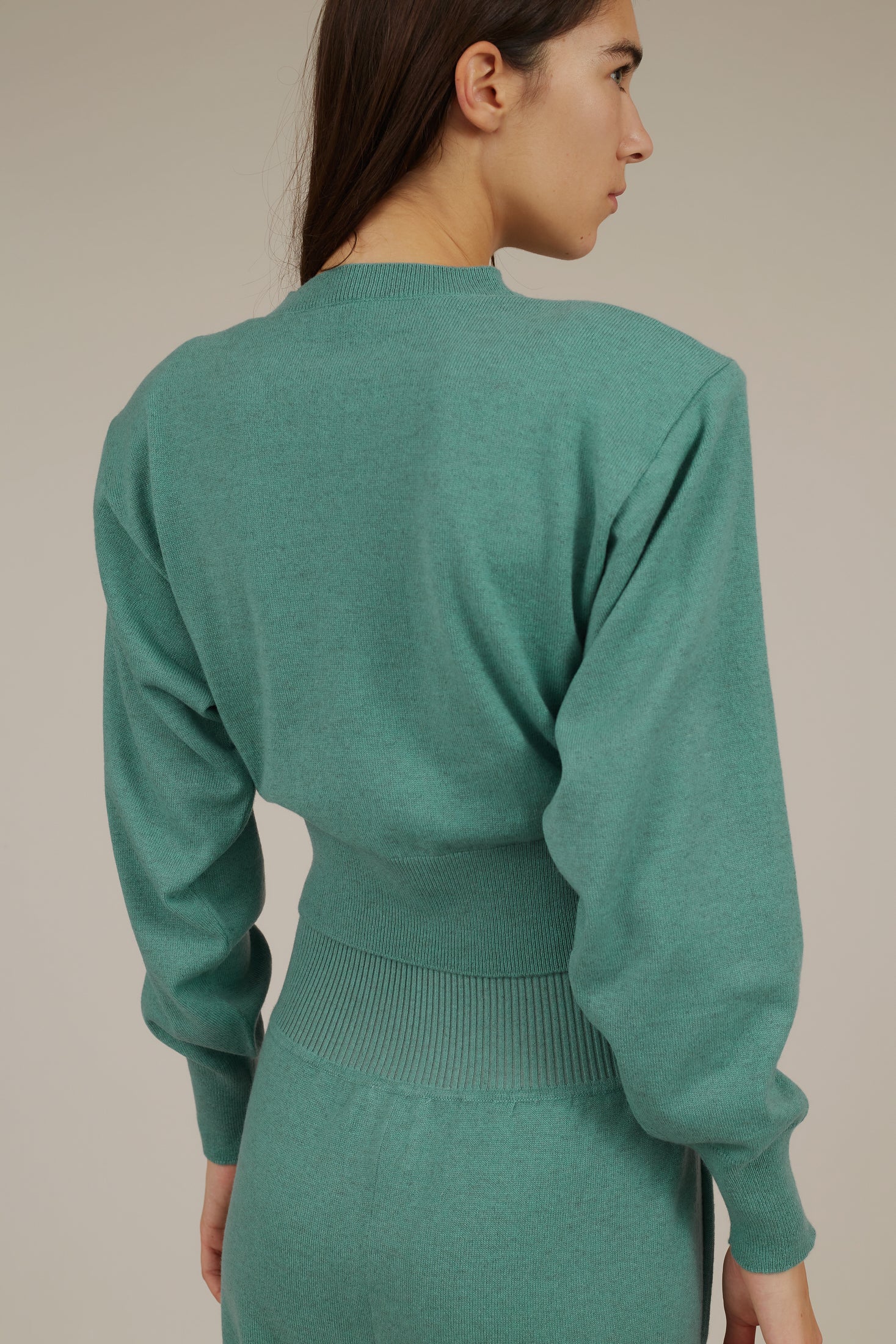 80's inspired padded shoulders and cropped, fitted waist create a striking silhouette.