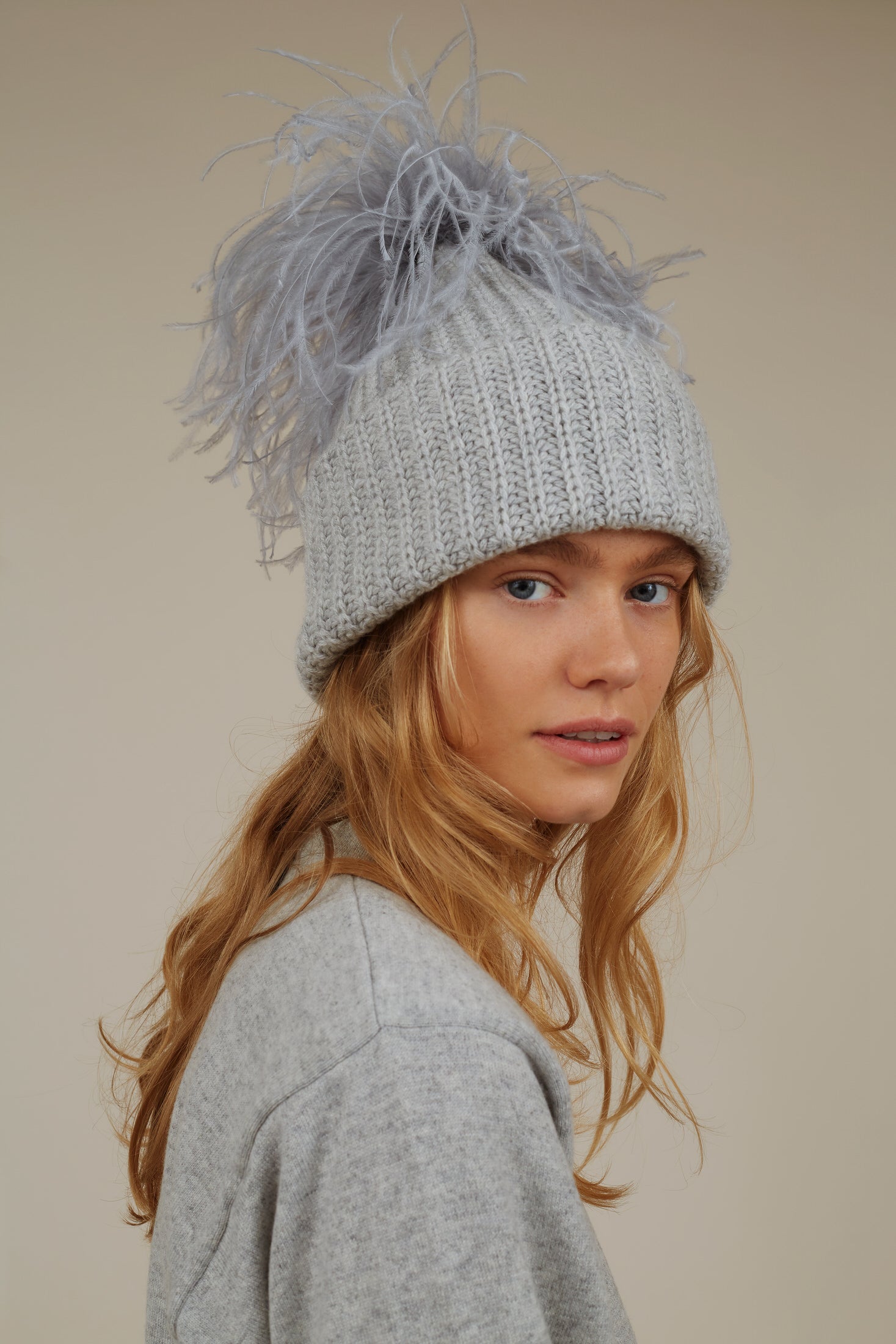 It's ribbed for a comfortably snug fit and has a wide fold-over brim, the feather decoration is so chic you'll almost wish for cold weather.