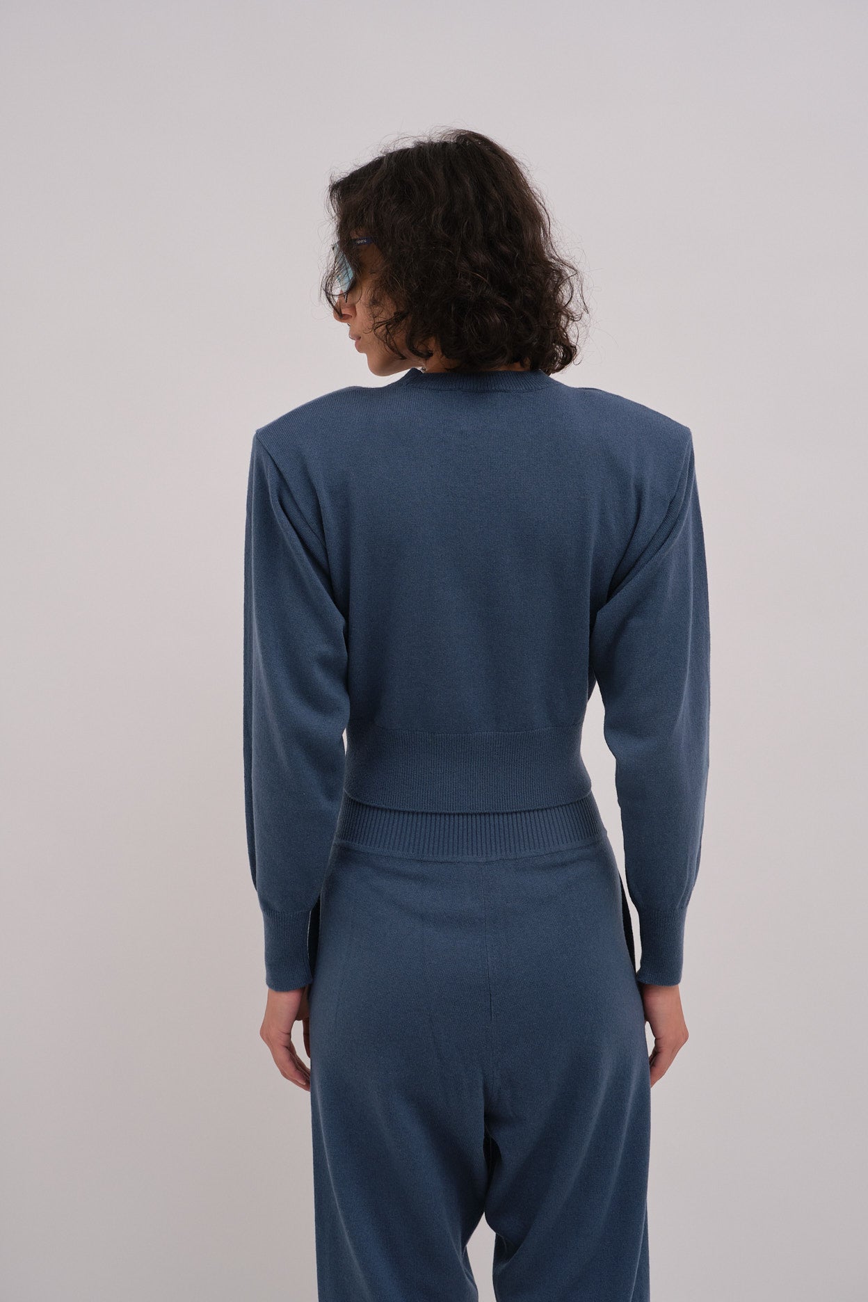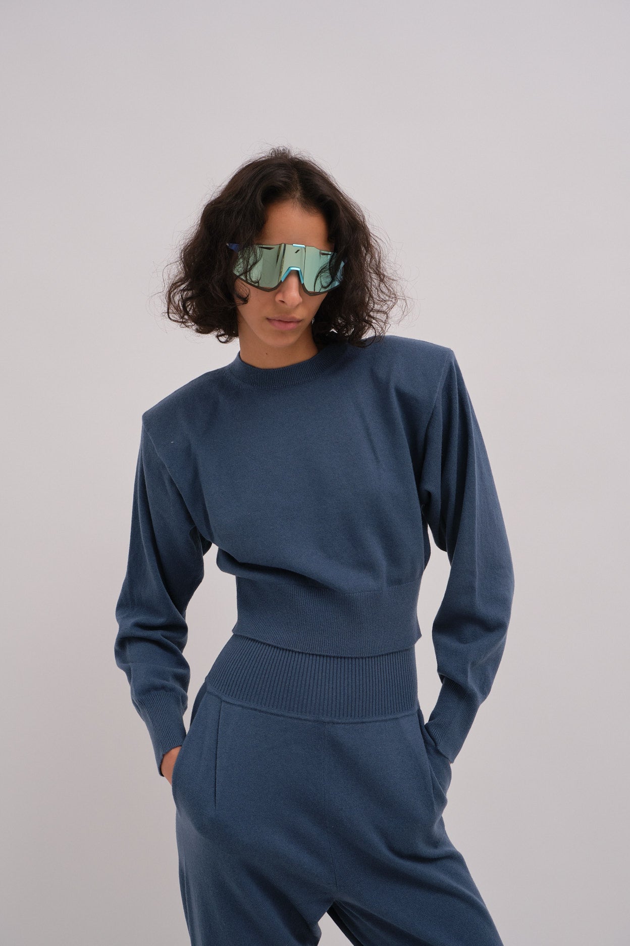 80's inspired padded shoulders and cropped, fitted waist create a striking silhouette.