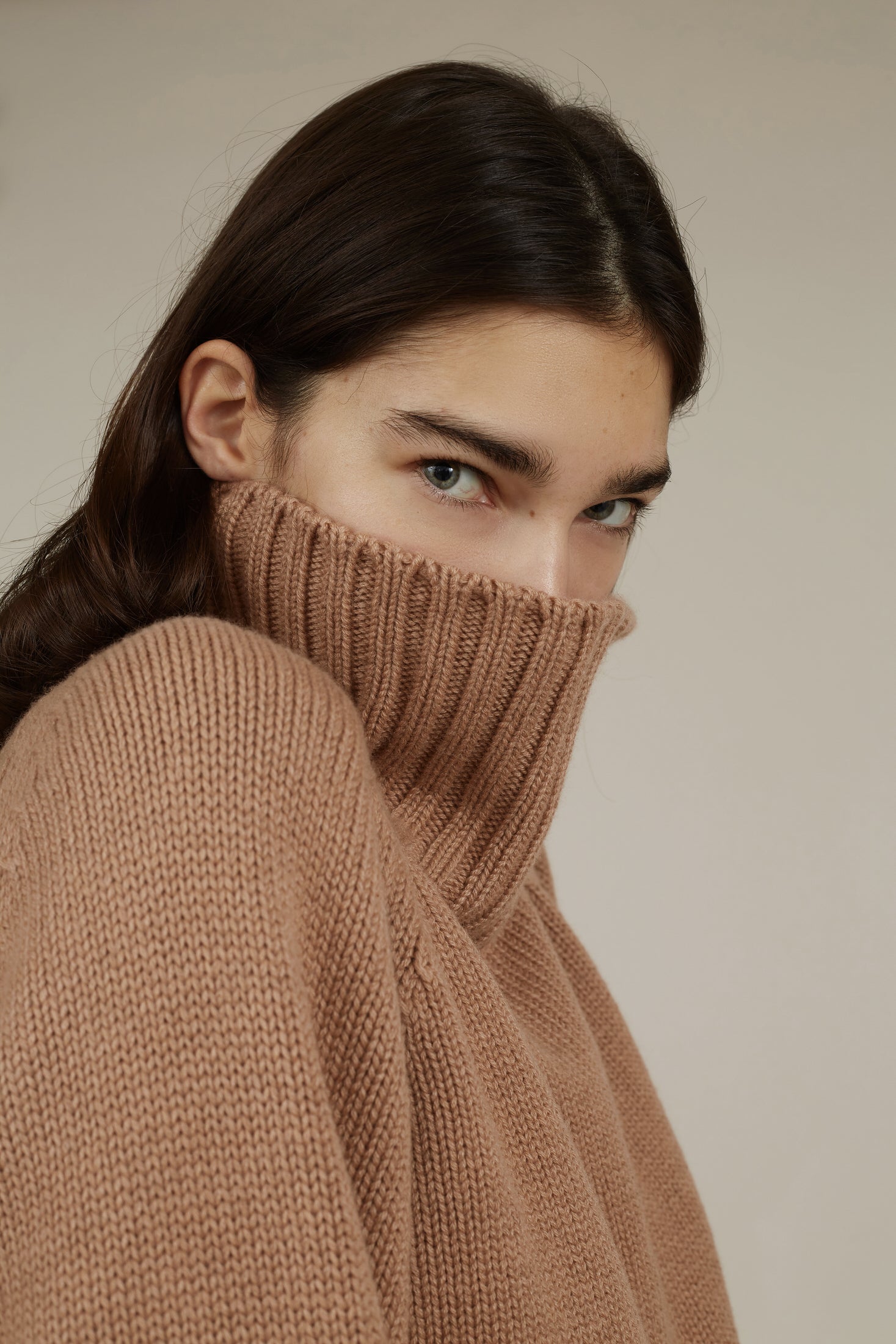 The loose fit is emphasized by raglan sleeves and a slouchy turtleneck, so versatile and timeless piece