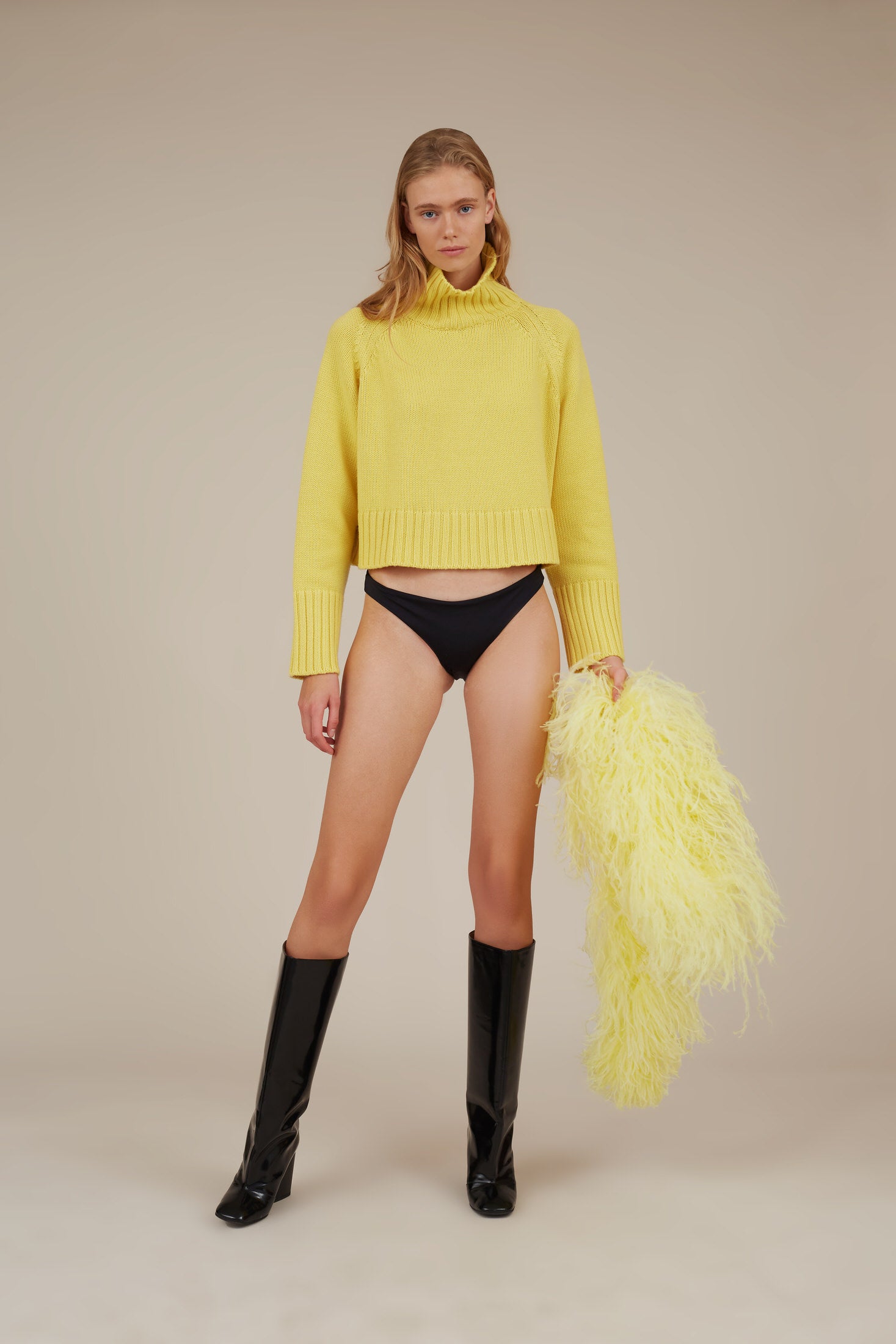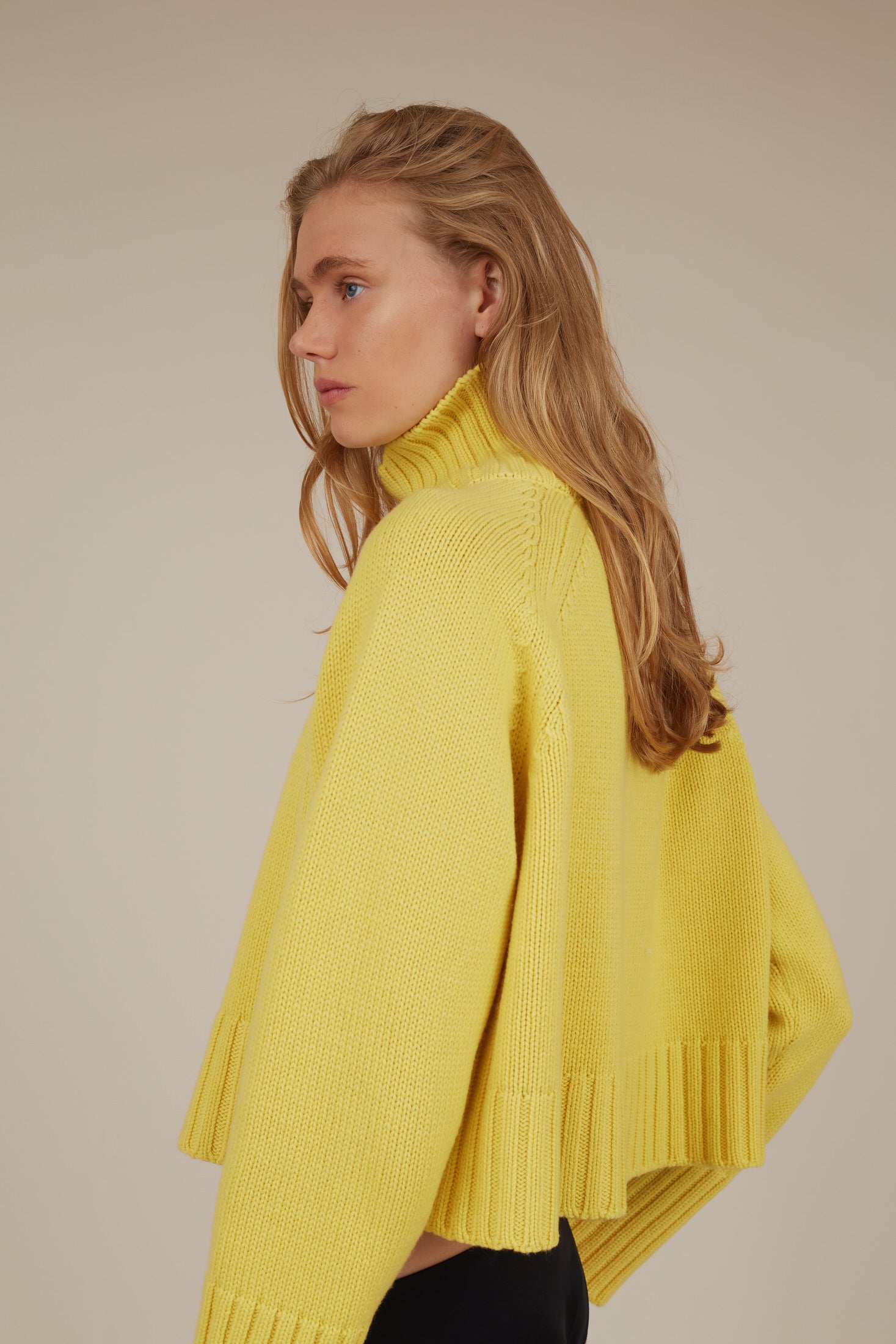 The loose fit is emphasized by raglan sleeves and a slouchy turtleneck, so versatile and timeless piece